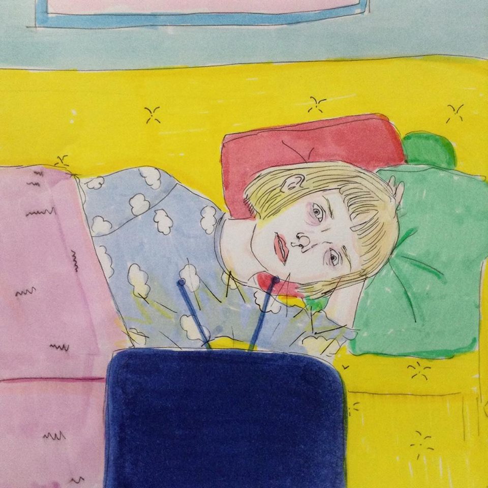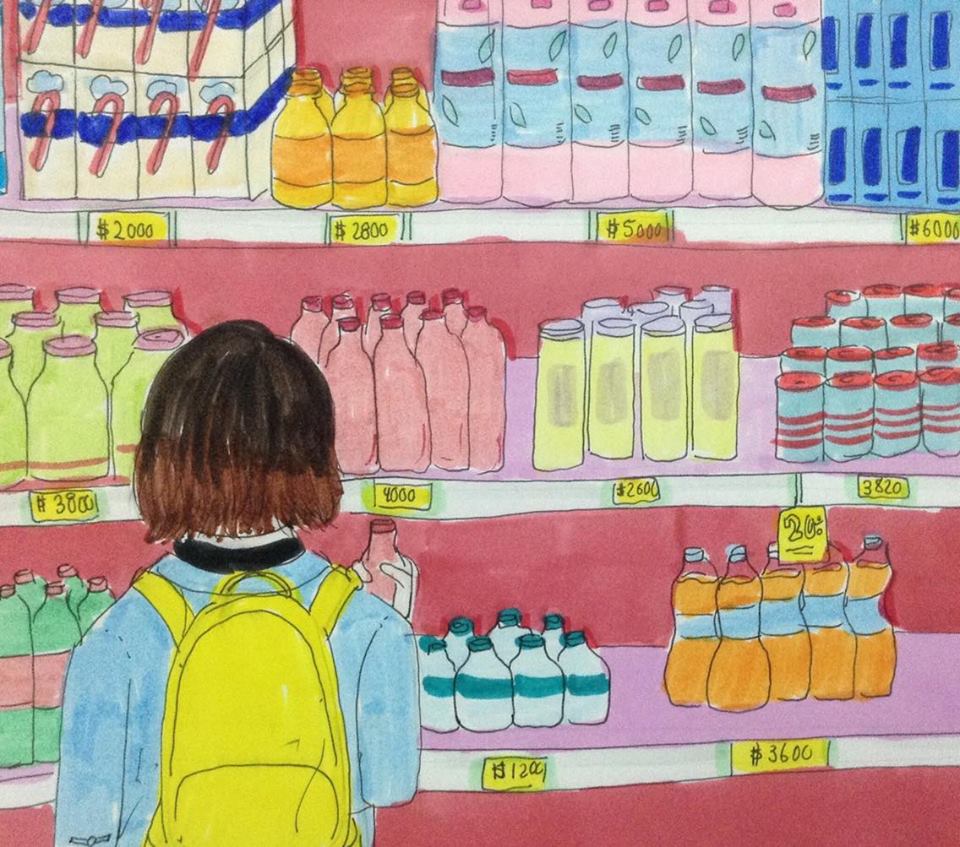 Por lo general en sus ilustraciones aparecen retratadas mujeres, en su mayoría, de pelo corto en situaciones cotidianas, rutinales o “normales”, envueltas en un ambiente tintado de colores suaves.