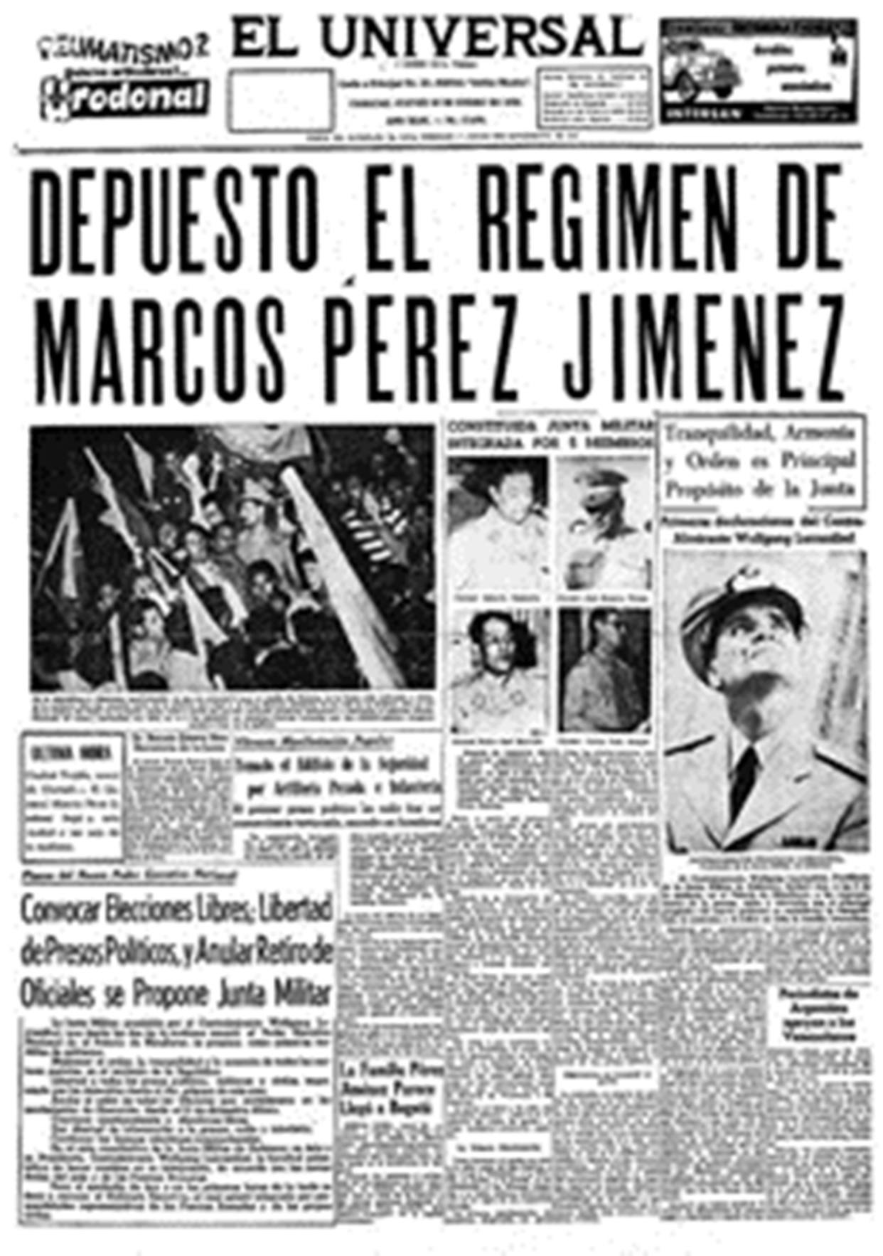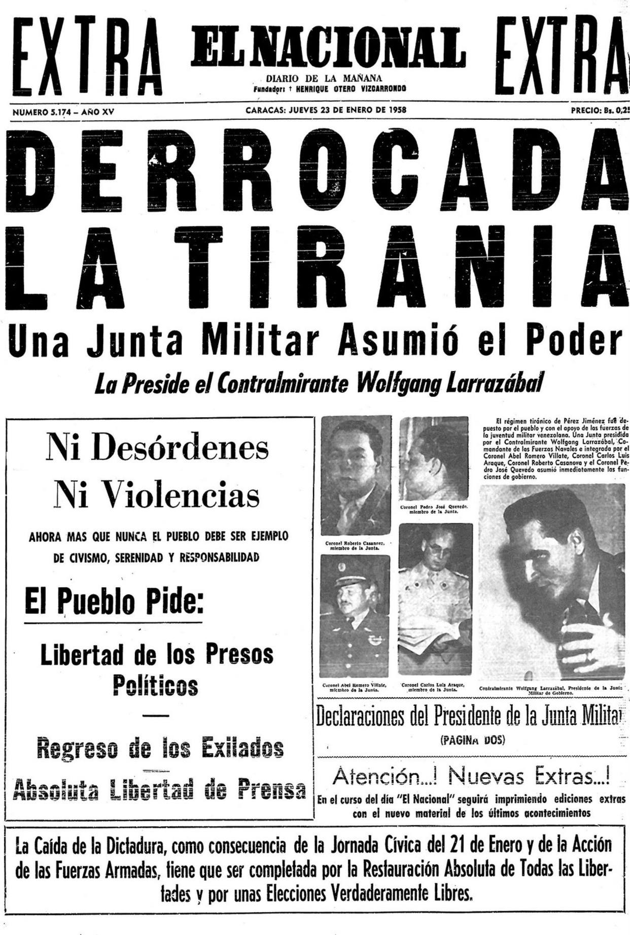 Durante la madrugada del 23 de enero, la Fuerza Armada retiró el apoyo al presidente Marcos Pérez Jiménez y le obligó a abandonar el Palacio de Miraflores. Desde el aeropuerto de La Carlota, en Caracas, Pérez Jiménez huyó hacia República Dominicana en el avión presidencial, conocido como la “Vaca Sagrada”. Asimismo, tanto los civiles como los militares tomaron las calles de la capital y de varias ciudades del país para celebrar el fin de la dictadura.